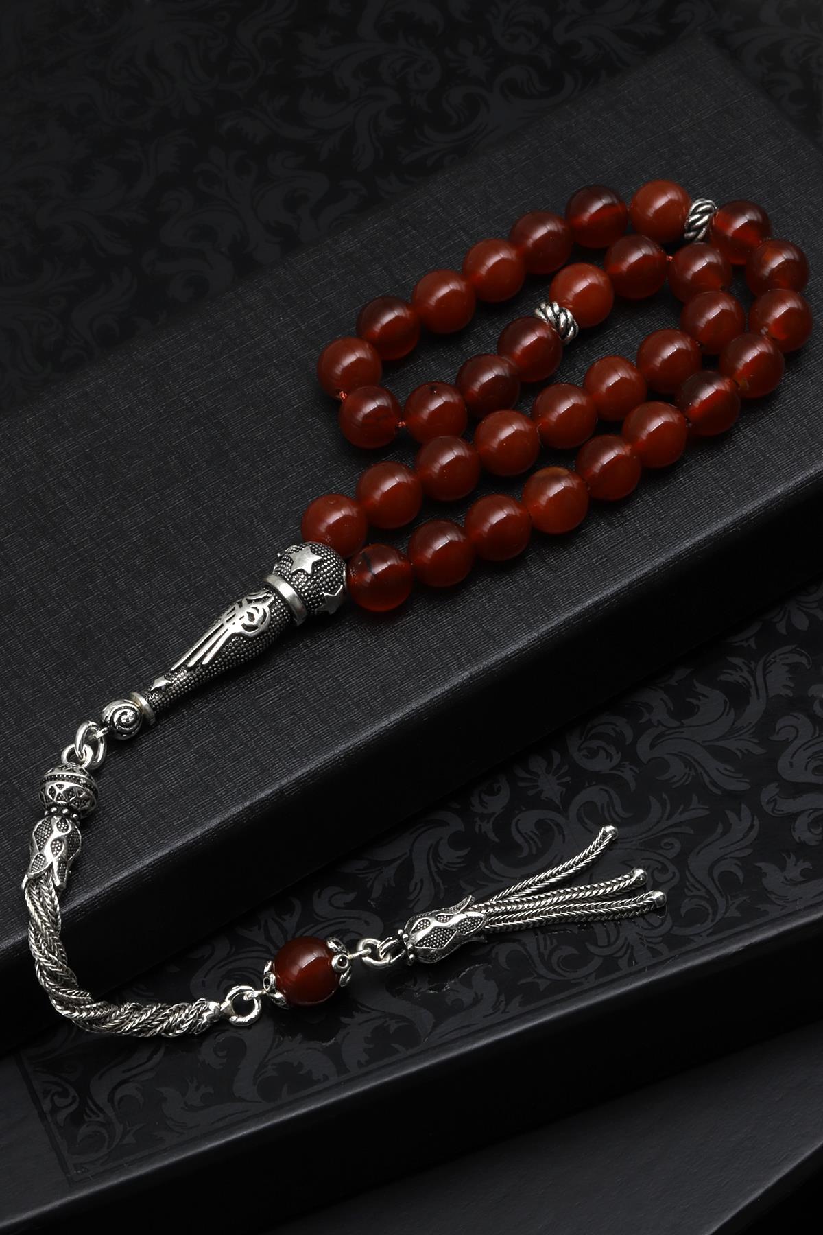 Akik Doğal Taş Tesbih 925 Ayar Gümüş 8 mm Küre Kesim