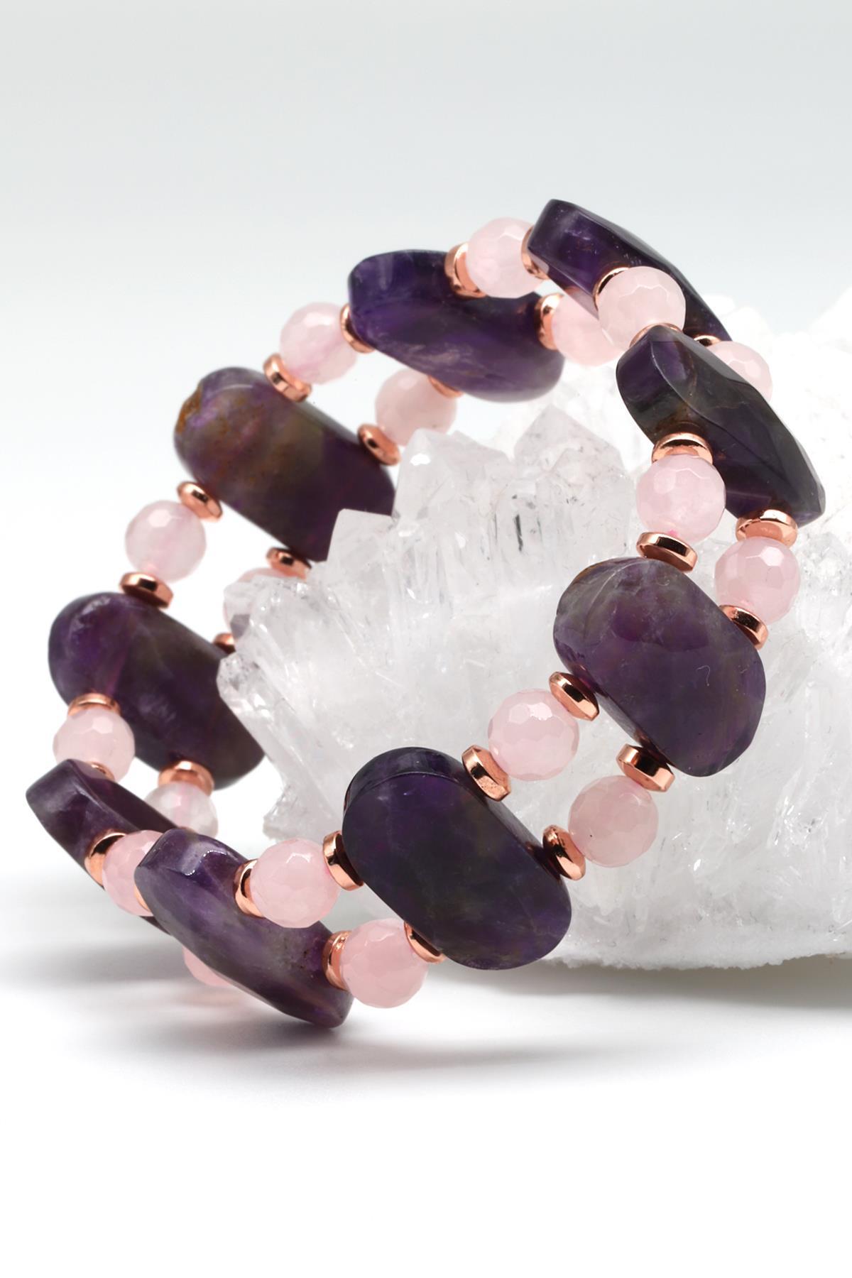 Ametist - Pembe Kuvars - Hematit Doğal Taş Tasarım Bileklik