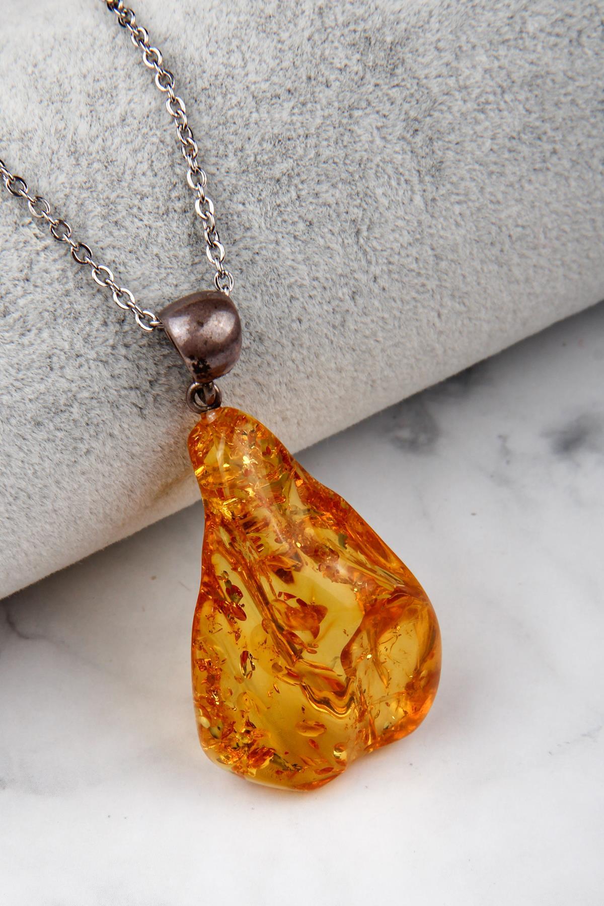 Damla Kehribar 925 Ayar Gümüş KolyeAĞIRLIK – 6,56 grGENİŞLİK – 2,8 cmUZUNLUK – 4 cmZincir Modeli Stok Durumuna Göre Değişebilir, Ortalama 45 cm dir.