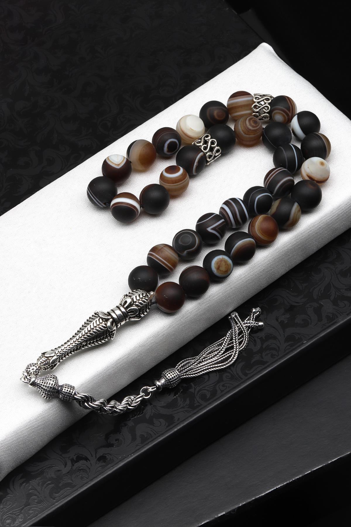 Göz Akik Doğal Taş Tesbih 925 Ayar Gümüş 10 mm Küre Kesim