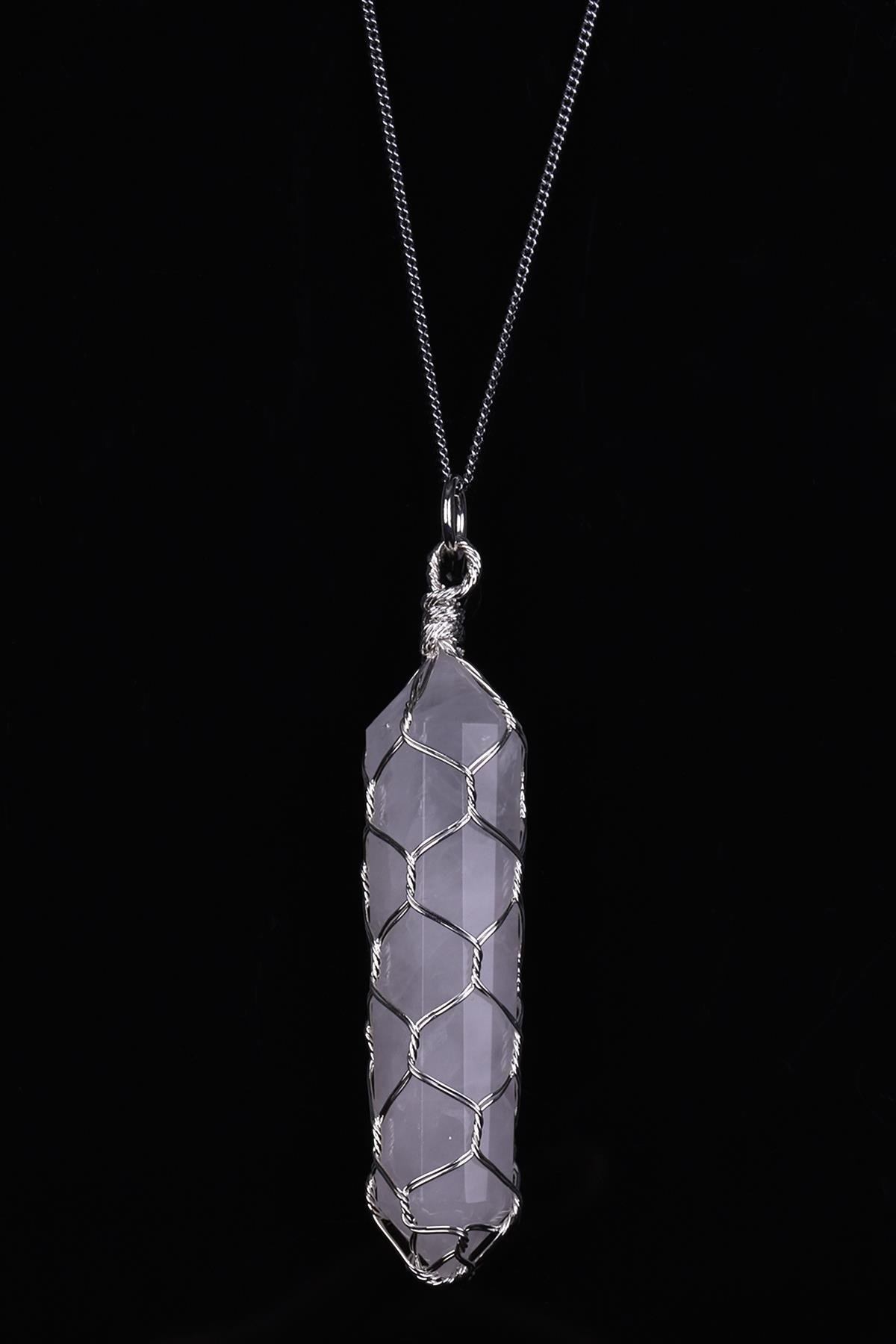 Kristal Kuvars Doğal Taş Tel Sarmalı Kolye