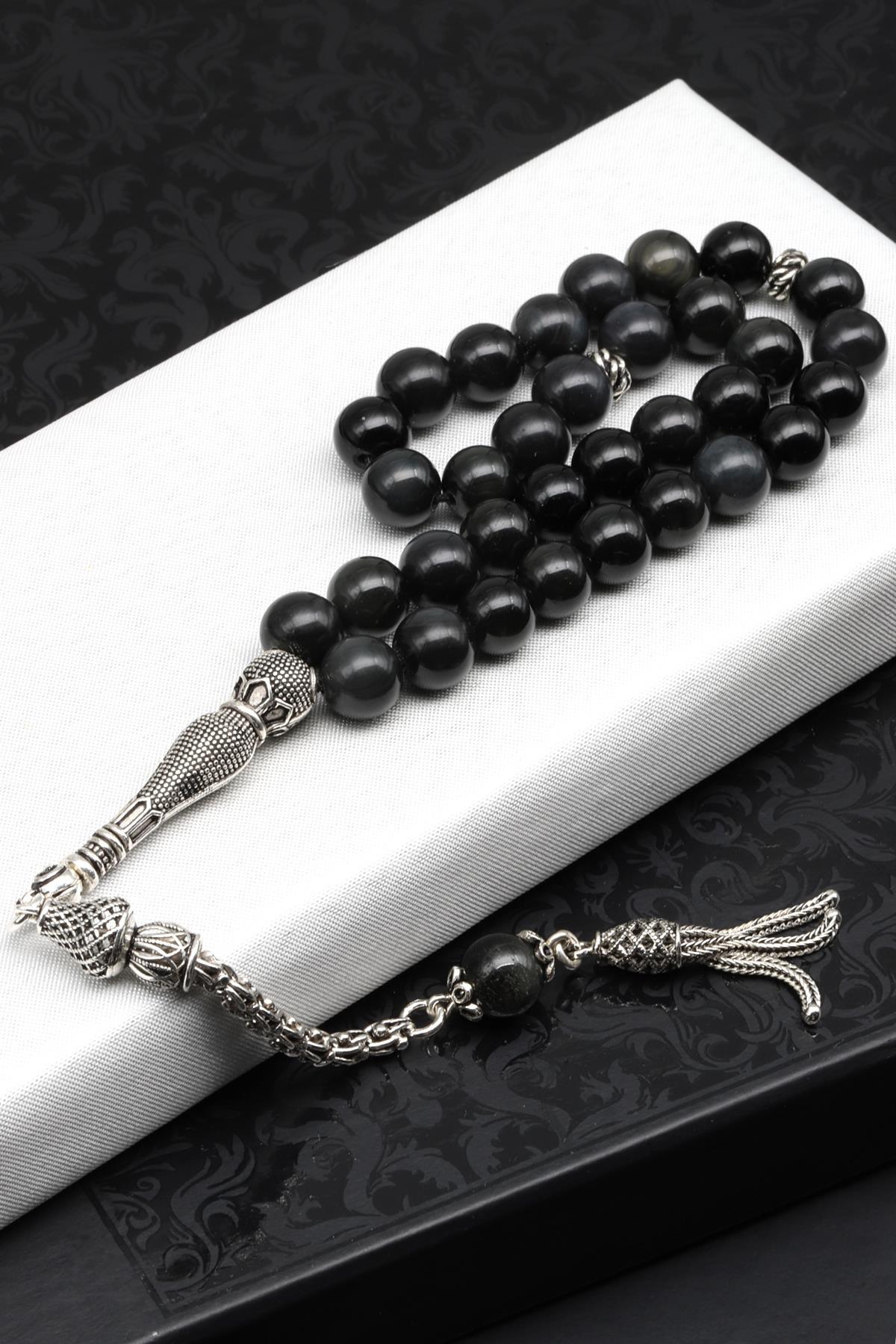 Obsidyen Doğal Taş Tesbih 925 Ayar Gümüş 8 mm Küre Kesim