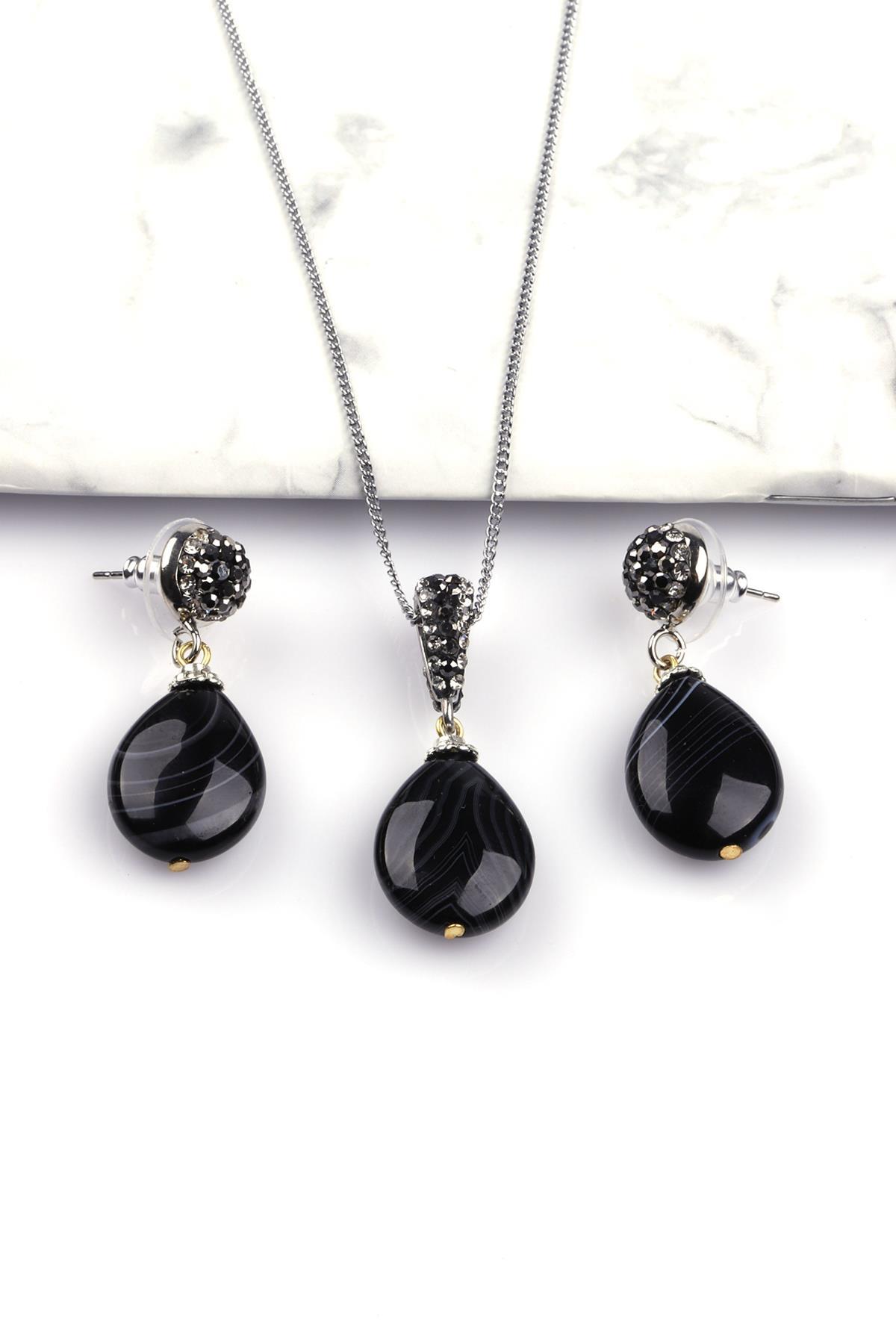 Siyah Akik Doğal Taş Kolye - Küpe 2'li Set