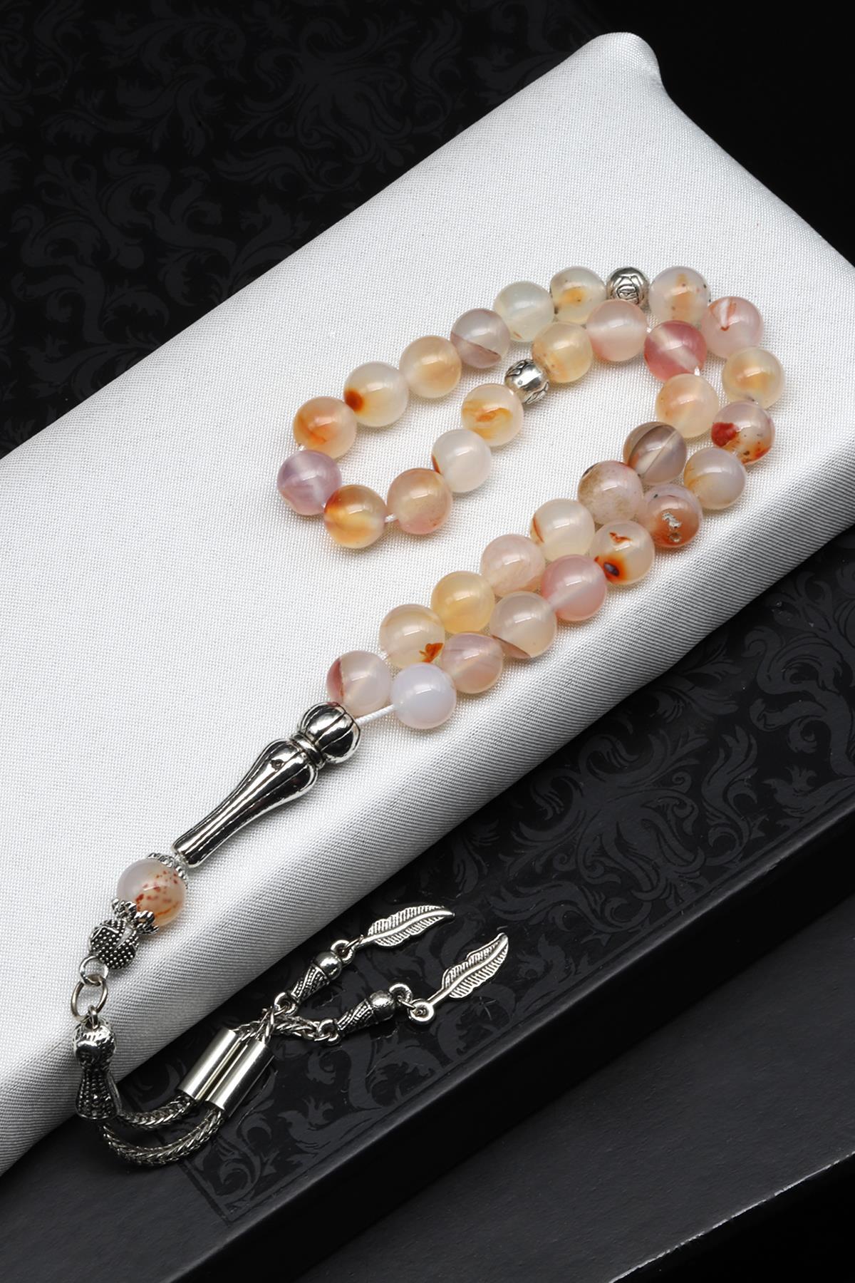 Turuncu-Beyaz Akik Doğal Taş Tesbih 8 mm Küre Kesim